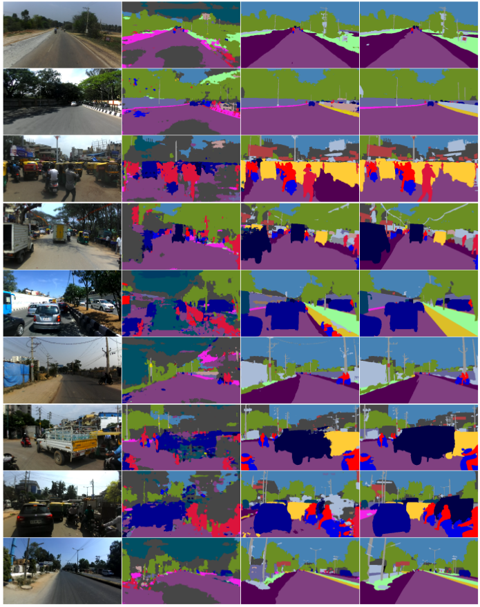 Some examples of the input images, predictions of a baseline Cityscapes pretrained model, predictions of the same baseline trained on this dataset and the ground truths from the validation set (in order of columns) can be seen below.