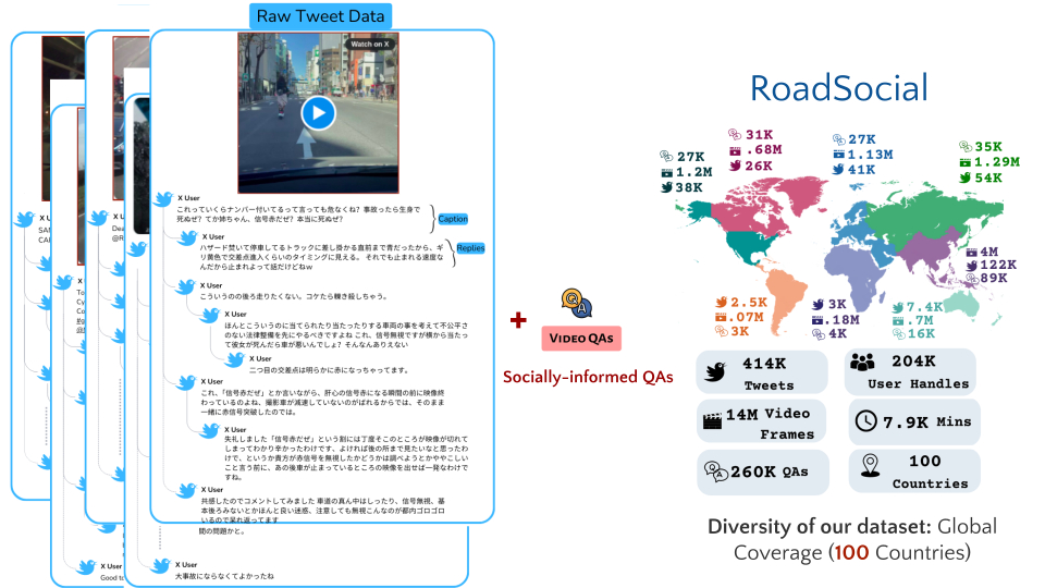 RoadSocial is a large-scale, diverse VideoQA dataset tailored for generic road event understanding from social media narratives. It differentiates itself from existing datasets by capturing the global complexity of road events with varied geographies, camera viewpoints (CCTV, handheld, drones) and rich social discourse. RoadSocial highlights: